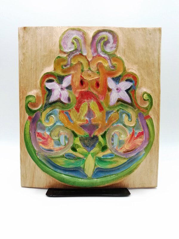 C802 Sculpture panel in hand-carved and lacquered wood, with the function of doorstop / papers / books.